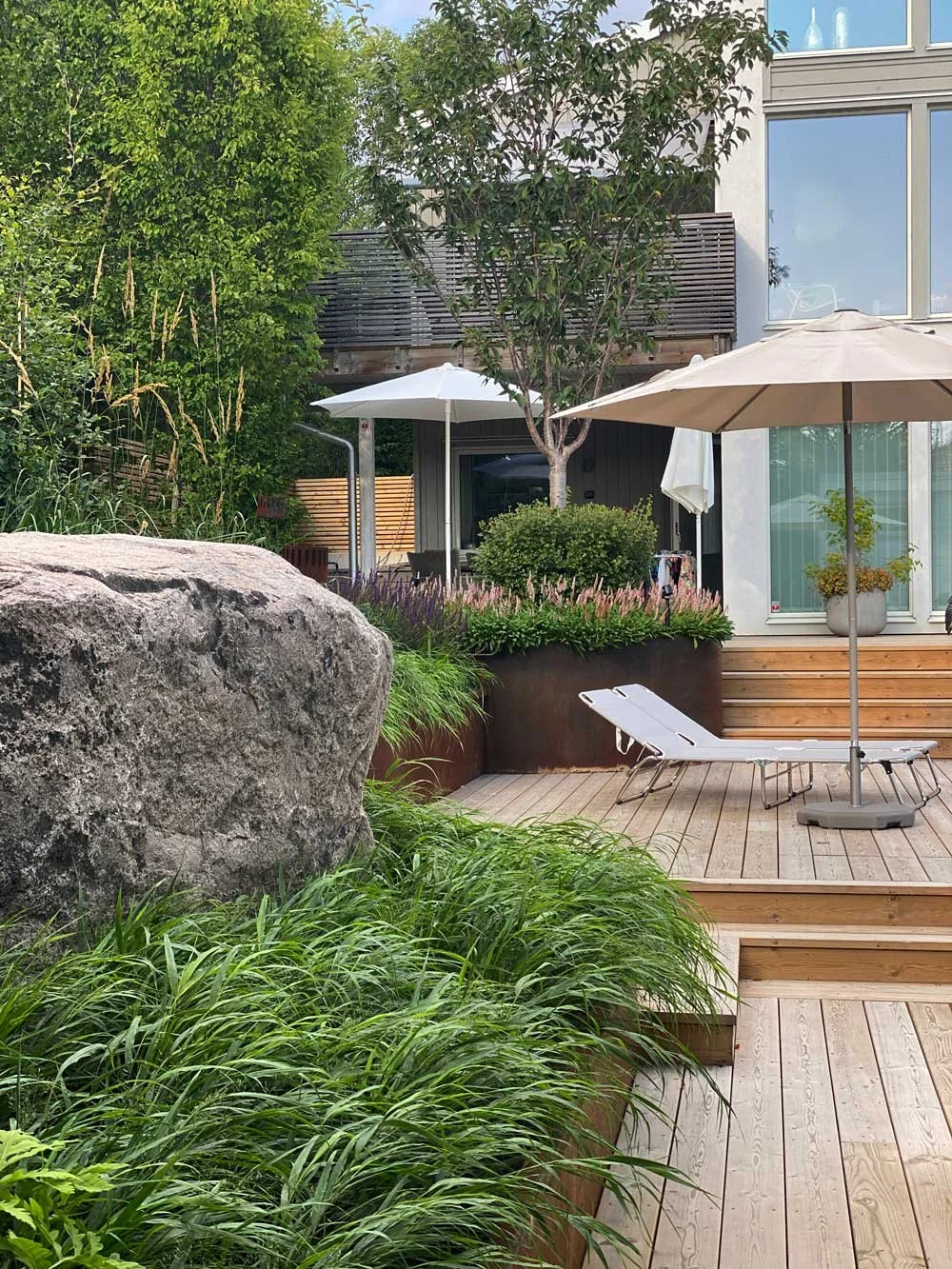 Hakonegräs väller över kanten på cortenklädda stödmurar, där en bockad kant döljer en inbyggd LED-list som ger en stämningsfull belysning på kvällen. En stor cortenring runt ett befintligt prydnadskörsbär blev en vacker detalj.